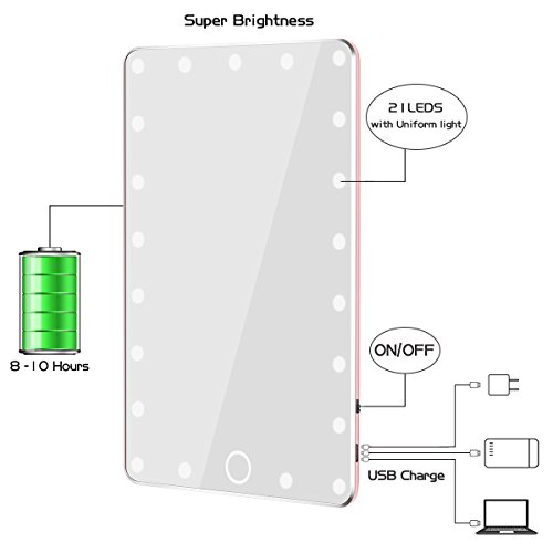 SUPER BRIGHT AND HIGH CLARITY: 21 LED lights with 5000hours lifetime design to mimic natural daylight which provide you a clear view in the mirror and perfect makeup environment in the dark or poor light areas to suit your preference perfectly with each detail taken care of.
