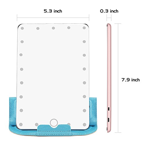 WELL-PROTECTION AND PORTABLE CARRY: 7.9inch perfect size as Ipad mini with PU leather cover,which protect and secure your LED travel makeup mirror from shocks, scratches and dust, as well as folding to support the mirror when needed; Wireless and ultra lightweight design provides convenience for you to carry with bags while outside or travelling.