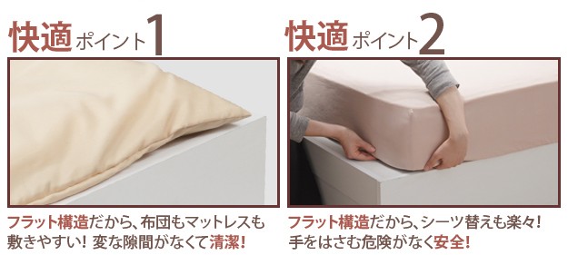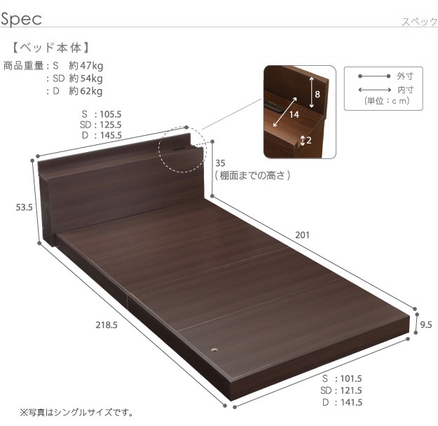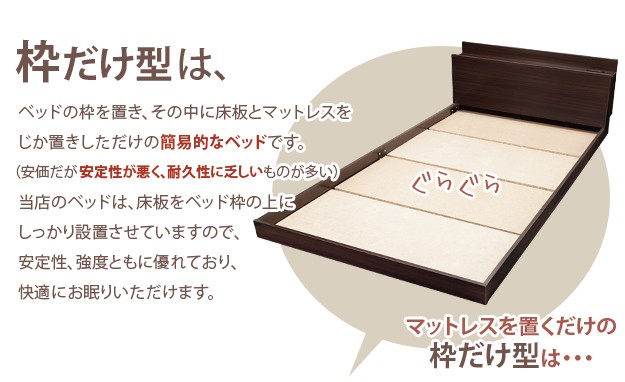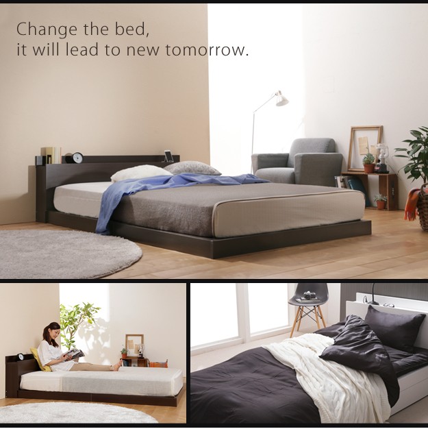 ●商品について:【マットレスがセットになった宮棚付きフロアローベッド】フレームと床面がフラットなためベッドメイキングが楽にできます。棚にはホコリ侵入防止用のフタが付いた2口コンセント(1500W)。マットレスは理想の寝姿勢を保つポケットコイルスプリング構造です。
