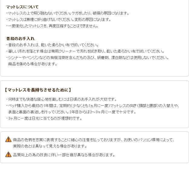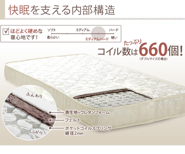 ●材質:[ベッド]本体-プリント紙化粧パーチクルボード、コンセント-2口(1500W)、[マットレス]側生地-ポリエステル100%、中身-ウレタンフォーム1cm、ポケットコイルスプリング高さ15cm・540個、不織布、フェルト