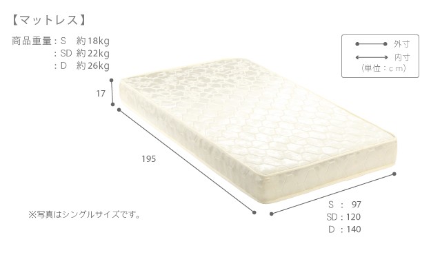 ●サイズ(cm):[ベッド]幅125.5×奥行218.5×高さ53.5(床板高さ9.5)cm・約54kg、[マットレス]幅120×奥行195×高さ17cm・約22kg