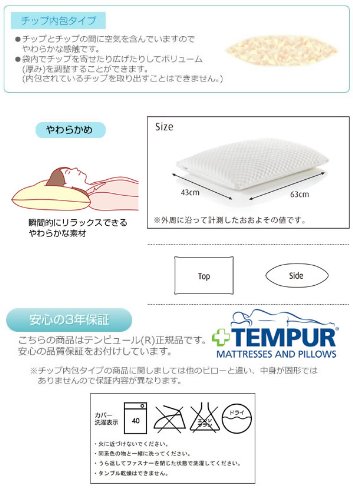 size / about 63 × 43cm weight / about 1.5kg Material Material / Tempur (R) ES material (chip enclosed type) Cover: 98% polyester, 2% polyurethane Specifications / Warranty: 3 years Accessories / warranty Country of manufacture / Denmark