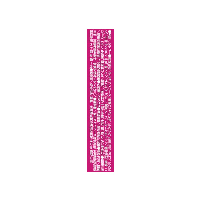 원재료:데미 글래스 소스,야채(감자,(당근)인삼,타마 파,샐러리,마늘)쇠고기,bouillon,우유,레드 와인,벌꿀,버터,농후 소스,토마토 케첩,식물성 기름지,식염,코시《―》,카라멜 색소,조미료(아미노산등)(원재료의 일부에 밀,대두,닭,돼지,사과를 포함한다)