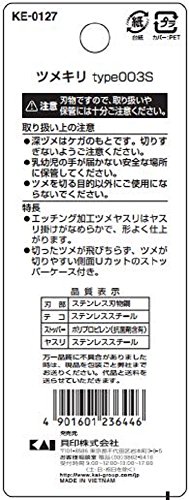 -. Binding : Health and Beauty -. Brand : Kai -. EAN : 0787734027069 -. Feature : Stylish looking nail clipper with stainless steel blade and lever / Small sized curved blade and handle / Comes with a nail catcher to catch trimmed nails / Stainless steel nail file made by etching provides smooth filing and easy shaping -. IsAdultProduct : 0 -. Label : Kershaw -. Manufacturer : Kershaw -. Model : 000KE0127 -. MPN : 000KE0127 -. PackageQuantity : 1 -. PartNumber : 000KE0127 -. ProductGroup : Beauty -. ProductTypeName : BEAUTY -. Publisher : Kershaw -. Studio : Kershaw -. Title : Kai 000KE0127 Nail Clipper, 003 S -. UPC : 787734027069