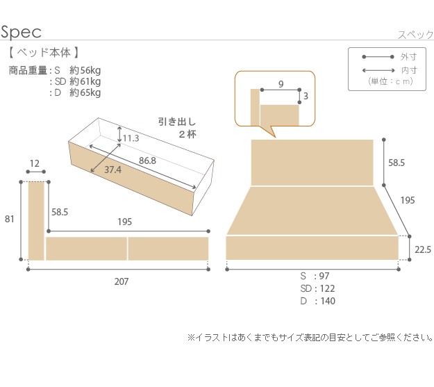 ●サイズ(cm):[ベッド]幅122x奥行207x高さ81(床板高さ22.5)cm・約61kg、[マットレス]幅122x奥行195x高さ23cm・約23kg
