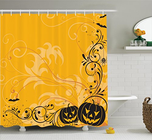 Halloween Decorations Shower Curtain Set by Ambesonne, Carved Pumpkins with Floral Patterns Bats and Spider Web Horror Themed Artwork, Bathroom Accessories, 75 Inches Long, Orange Black