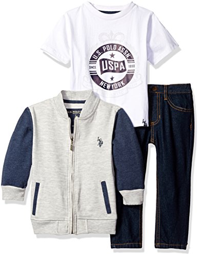 -. Binding : Apparel -. Brand : U.S. Polo Assn. -. Department : boys -. Feature : French terry varsity jacket has rib knit neckline, cuffs and hem. Two front pockets / 5 pocket blue denim jeans / Iconic logo jersey t-shirt comes in creeper for new born sizes / Iconic branding -. Label : US Polo Assn. Children's Apparel -. Manufacturer : US Polo Assn. Children's Apparel -. ProductGroup : Apparel -. ProductTypeName : PANTS -. Publisher : US Polo Assn. Children's Apparel -. Studio : US Polo Assn. Children's Apparel -. Title : U.S. Polo Assn. Toddler Boys' Varsity French Terry Jacket, T-Shirt and Denim Jean