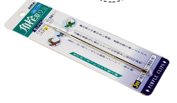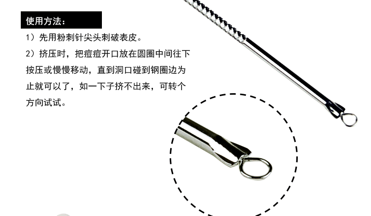 4)先使用粉刺针尖头的一端轻刺患处(暗疮针、粉刺、青春痘等部分)再用另一段圆圈部分轻轻按下患处,保持患处在圆圈之内;顺势小心的移动暗疮针、暗疮、粉刺、青春痘将随之而出,使用后,再用爽肤水清洁一次,肌肤更加清爽干净,细腻柔滑。