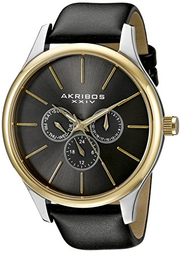 -. Binding : Watch -. Brand : Akribos XXIV -. Color : Black/Silver/Gold -. Department : mens -. EAN : 0848572072151 -. Feature : Radiant dark gray sunburst dial with three hand movement with date subdial / Individually hand applied gold tone stick index with gold tone dauphine style hands / Polished two tone stainless steel case with black genuine leather strap / Quartz movement with analog display / Water-resistant to 30 M (100 feet) -. Label : TWI Watches, LLC -. Manufacturer : TWI Watches, LLC -. Model : AK870YGB -. MPN : AK870YGB -. PackageQuantity : 1 -. PartNumber : AK870YGB -. ProductGroup : Watch -. ProductTypeName : WATCH -. Publisher : TWI Watches, LLC -. Studio : TWI Watches, LLC -. Title : Akribos XXIV Men's AK870YGB Round Silver Dial Three Hand Quartz Two Tone Strap Watch -. UPC : 848572072151