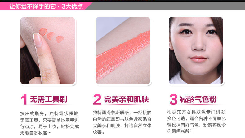 The name Hydra blush Cream Apple muscle orange bare pink multi-purpose delicate moisture not floating powder 5 color selection The origin of Chinese specification 7g Texture paste and shelf-life of 3 years The main efficacy blush, eyeshadow, lip Treasurer recommended Rouge as a point clear of the pen, can let you look a few years youngereffect, in addition to modified Lian Xing, also can make the whole makeuplook more healthy For the crowd All the beauty of the MM Product introduction need no paint directly by hand to open halo smear. Is obedient cream texture contains natural moisturizing factor, can create aspecial natural and tender, rosy complexion! Naturally rosy to face naturaltips! Rich colors, let you show free color according to mood, for love of selfplaying sister! When applied according to the focus and concentration forcecontrol makeup. Waterproof anti sweat, lasting color will not easily fall off,and the skin more obedient 100%! Easily solve the problem of floating powder! As a natural surface attractive color ruddy face! Using the method of light with a little in the palm of the hand, halo openedafter the pat on the cheek, then quickly with the fingers open halo,! When a modest increase in weight is enough. A tank can be used for a long time, it is value for money products, easy to create a natural look good oh! |