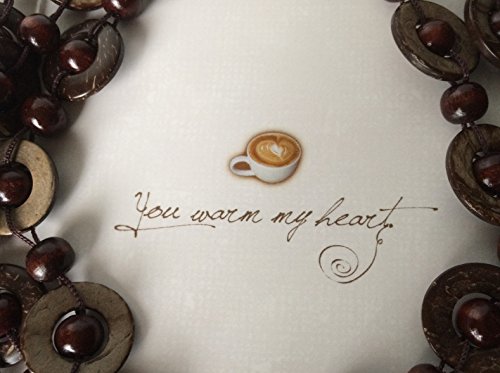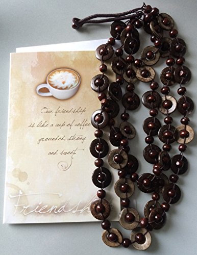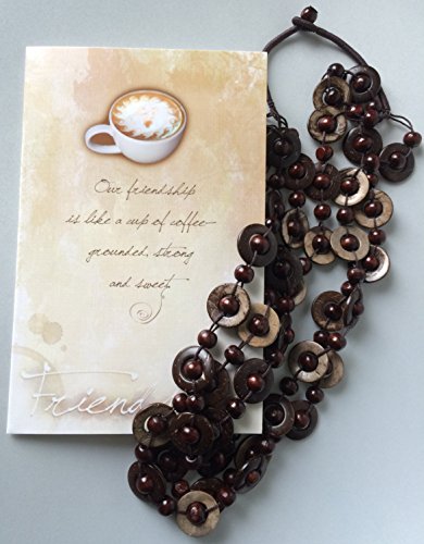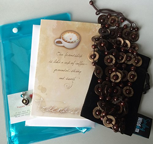 Smiling Wisdom - Coffee Friendship Greeting Card Necklace Gift Set - Multi-colored Brown Tan Neutral Wood - Coffee Cup Charm and Velvet Satin Lined Bag - For Girl, Teen, Woman