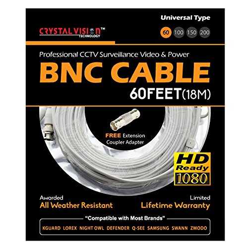 Crystal Vision Premium 1080P HD BNC CCTV Surveillance Security Camera Combo Cable Premade Siamese W/ Coupler for Samsung, Lorex, Swann, Q-See, Defender, Amcrest, Zosi, Kguard, etc, 60'