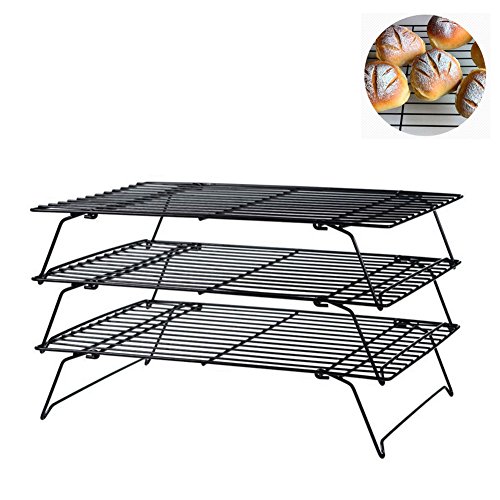 -. Feature : 3-tier cooling rack stacks for cooling or baking cookies, pies, pizza,skewer and cakes,much more stronger and higher resistance to rust than most of the cooling racks in the market. / Reinforced nonstick coating for easy release and clean-up.Safe in the dishwasher. / Collapsible for space-efficient use, allows airflow while securely holding small or large items. / Stackable with stable footing.The nonstick grid surface keeps items from falling through / Package contains one 3-tier cooling rack,each measuring35*25*7cm.