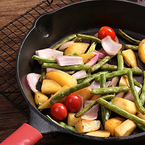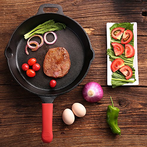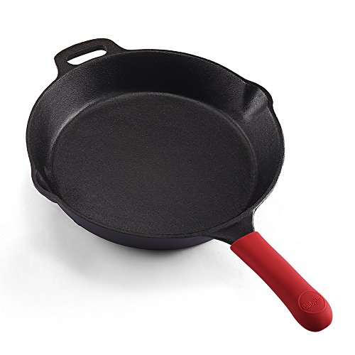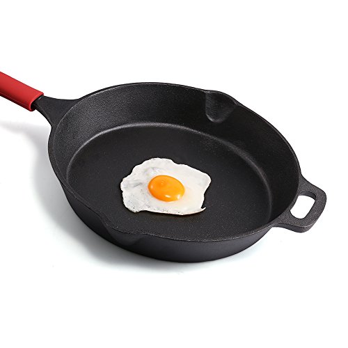 12 INCH CAST IRON SKILLET with SECURE SILICON HANDLE.Suitable for both stovetop and oven for cooking variety of different meals.With secure silicon handle you can easily handling hot cookware on the stovetop