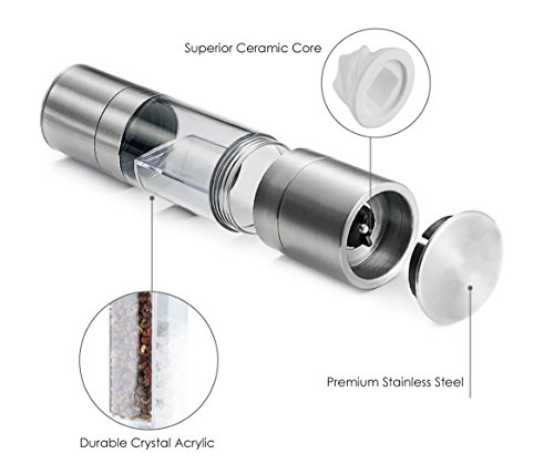 ELEGANT & EFFICIENT DESIGN: Double-ended design offers multi-uses for a variety of spices. It is polished to provide smoother operations for every level of grinding. Moreover, the harmonious combination between the premium stainless steel cover and the crystal acrylic container supports the overall universal and clear construction.