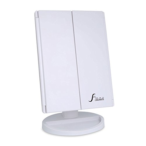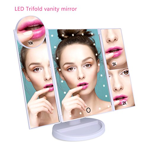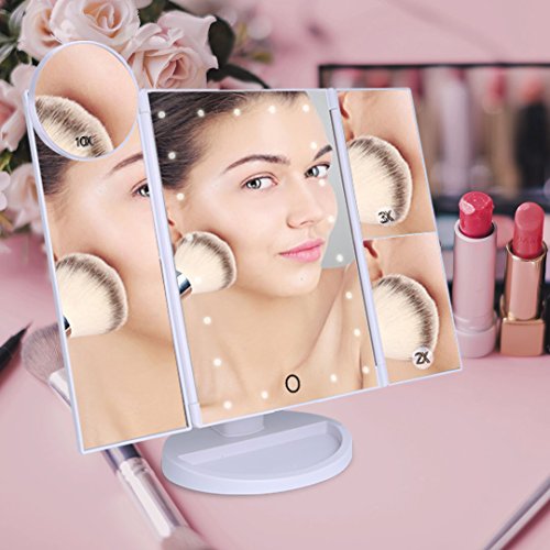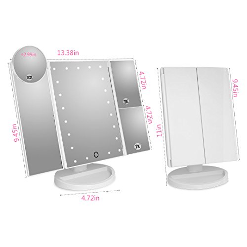 LED Vanity Mirror, Professional Dimmable Trifold Makeup Mirror with 21 Led Lights, Touch Screen, 1×2×3×10x Magnifying, 180°Adjustable, USB Charging for Cosmetic Make Up, Bathroom,Lighted-White