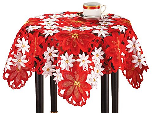 -. Feature : Embroidered Poinsettia Table Linens / Table linen features beautiful openwork pattern of bright red and white poinsettias with gold detailing / Machine washable; Made from polyester / Available as Runner or Square. Runner measures 68"L x 13"W, Square 34"Sq / Shop with confidence! For over 50 years, Collections Etc has been bringing unique, whimsical, inspirational, and home solution products to customers. All Collections Etc products come with a 60 day, easy return policy and 100% satisfaction guarantee