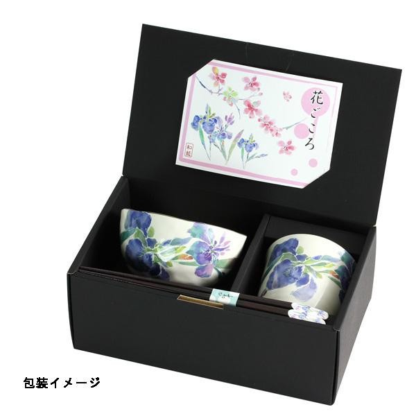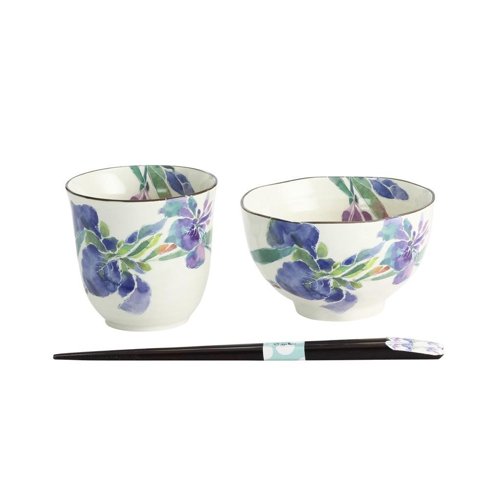 | 春を彩るアヤメを鮮やかに描いた飯碗・湯呑・天宝箸のセット。大切な方へのギフトにも最適です。 |