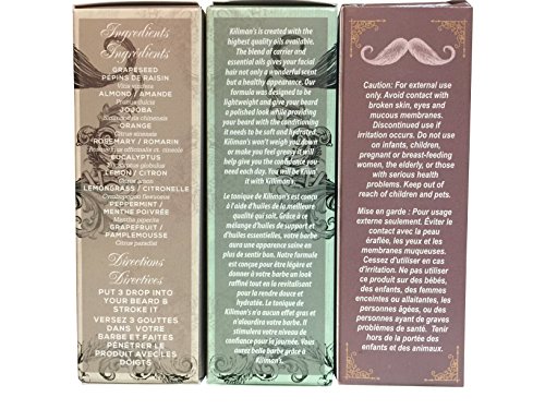 Studio : Nature's Distribution Publisher : Nature's Distribution Binding : Misc. Product Description Kiliman's won't weigh you down or make you feel greasy it will give you the confidence you need each day. You will be Killin'it with Kilimans . Directions-Put 3 drops into your beard and stroke it. Ingredients- Grapeseed, Almond,Jojoba and Frankincense. 0