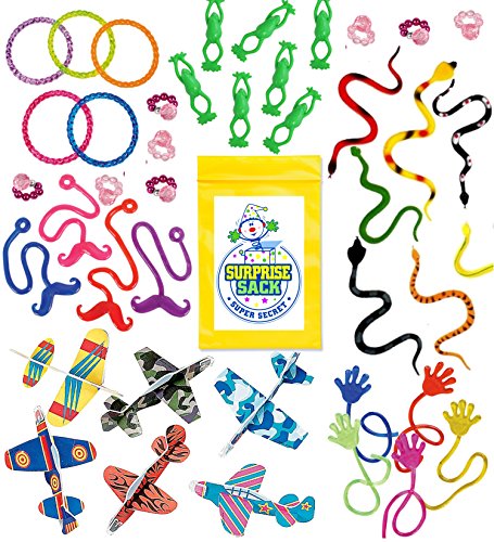 -. Feature : Our 100 Pc Terrific Toy Assortment is EXCLUSIVELY designed by DOWN TO THE LAST DETAILS, LLC. We promise that we will not substitute or alter from our product description. If you purchase this from a different seller other than Down to the Last Details, you are purchasing a knockoff and we cannot promise you will receive the same as described above. / Our 100 Pc Terrific Toy Bulk Assortment contains: / 16 Foam Glider Airplanes measuring 4.5 x 5.5 inches long, 12 Pink Diamond Gemstone Rings, 12 Bracelets, 12 Sticky Hands, / 12 Sticky Mustaches, 12 flying frogs, 12 Rubber Rainforest Snakes, and 12 other fun novelty toys. / 1 Super Secret SurP.R.Ise Sack! (trademark pending) This bonus gift can be used as a door P.R.Ize, an achievement reward, or as a gift for the winner of a party game. The Super Secret SurP.R.Ise Sack is resealable, comes in bright, bold colors and will contain a fun, unique toy for one lucky kid.