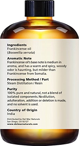 -. Feature : Del Mar Naturals frankincense essential oil - 100% pure and natural; non-toxic; no additives; unfiltered and undiluted with no fillers; therapeutic grade; packaged in USA / Frankincense is a great oil to have for household cleaning. Use it in an essential oil diffuser to help reduce indoor pollution and to deodorize and disinfect any room or surface in your home. / SAFETY WARNING: For external use only. Other than aromatherapy, dilute with a carrier oil. For topical use, rub a very small amount on the inside of your elbow area to test for any allergic reaction before use. Keep out of the reach of pets. Essential oils can be potentially toxic to pets at certain concentrations. Cats can be especially sensitive to essential oils. Avoid contact with eyes, keep out of the reach of children. If pregnant, consult with your health care provider before use / Frankincense oil blends well with clary sage, geranium, lemon, lavender, rose, sandalwood, and ylang ylang / Purchase with complete peace of mind, we are confident we have provided the absolute best frankincense oil in the market. If you are not completely satisfied with Del Mar Naturals Premium Quality Frankincense Essential Oil, we will refund your purchase
