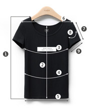 | 尺码 | ①前衣长 | ②后中长 | ③胸围 | ④下摆围 | ⑤腰围 | ⑥肩宽 | ⑦袖长 | ⑧袖臂围 | ⑨袖口围 | ||