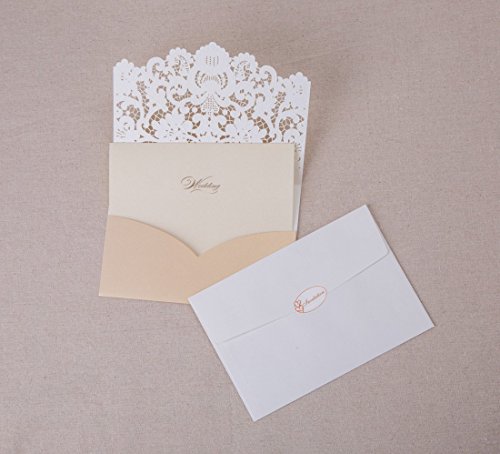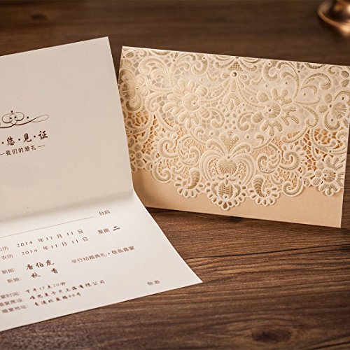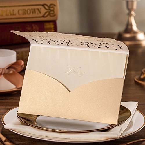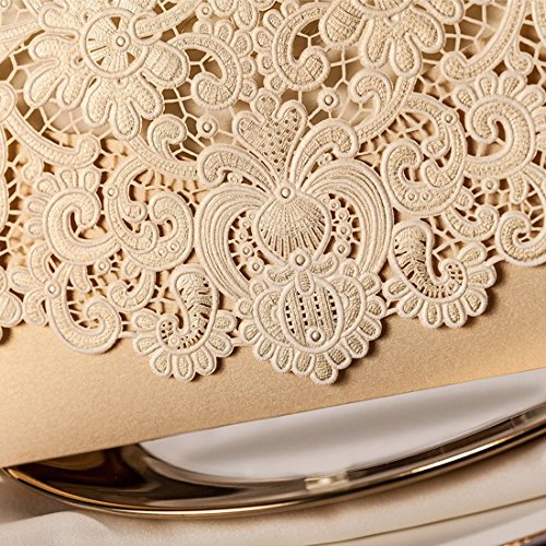 Wishmade 50pcs Gold Laser Cut Wedding Invitations Cardstock Kits with Embossed Flowers Pocket Design Cards For Marriage Party Supplies (Set of 50pcs) CW072