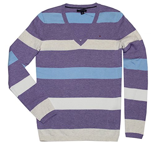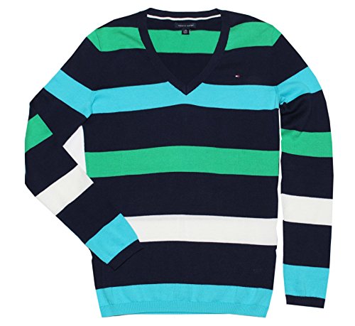 Tommy Hilfiger Women V-neck Striped Logo Sweater. 100% cotton. Made in China.