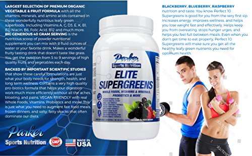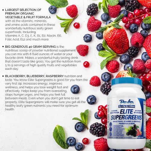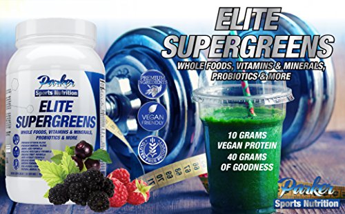 ELITE SUPERGREENS is the superior nutritional supplement that gives you a mighty 5 to 9 servings of premium fresh vegetables and fruits every day. Each bottle contains 30 BIG 40 gram servings. Simply stir a scoop into 8-12 fluid ounces of water or other drink. Take up to 3 times daily for amazing nutrition. Your body gets all the vitamins, minerals, grains, amino acids, and antioxidants you need for ultimate wellness, increased energy, and an improved outlook that makes you seem younger and more vibrant. TOP OF THE LINE SUPERFOOD with very High End Ingredients in all categories. This is the finest all-in-one supplement available. Take this daily to give your systems, organs, and entire body the nutritional support it needs to fight disease, avoid illness, and make you feel better than you have in years. NATURAL HERBAL FORMULA with powerful pro-biotics to soothe digestion. Even with all this green nutrition, this powder does not taste like grass the way many others do. Spirited, delicious Blackberry, Blueberry, and Raspberry flavor with all the associated vitamins and minerals to help regulate every aspect of your body. Premium Vitamin Blend Premium Mineral Blend Amino Acid Formula Organic Vegetable Formula Organic Fruit Formula Anti-Oxidant Formula Organic Grain Blend Enzyme Formulation Pro-Biotics Formulation Natural Herbal Formula 100% MONEY BACK GUARANTEE ensures this will be your best bet for an exciting no-risk purchase. Many customers love this supplement so much they return to purchase 2 or 3 more containers for many months of benefits. HURRY AND BUY NOW while we have a fresh shipment in stock. This makes a much appreciated gift for friends, family, and co-workers.Feature