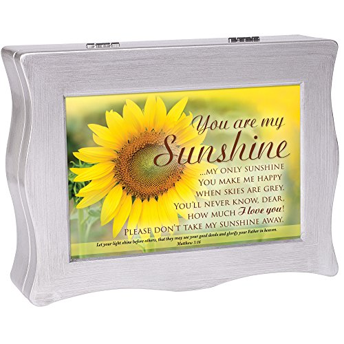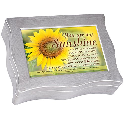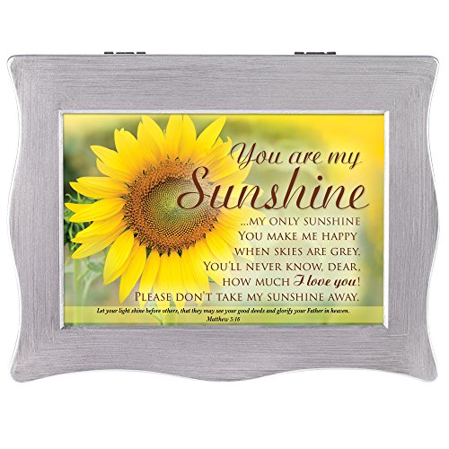 -. Binding : Kitchen -. Brand : Cottage Garden -. Color : Silver -. EAN : 0633303829841 -. Feature : Personalize your keepsake box by replacing sentiment art with a personal 6 x 3 inch photo / Features scripture verse Matthew 5:16; replace sentiment art with your personal 6 x 3 inch photos or art / Made of polycast wavy edges; interior lined with rich, black velvet / Keepsake box comes in own bubble bag with fitted box for easy gifting / Measures approximately 6.75 x 3 x 9 inches -. IsAutographed : 0 -. Label : Cottage Garden -. Manufacturer : Cottage Garden -. MPN : CLBWS2S -. PartNumber : CLBWS2S -. ProductGroup : Home -. ProductTypeName : HOME -. Publisher : Cottage Garden -. Studio : Cottage Garden -. Title : You Are My Sunshine Only Sunshine Silver Wavy Keepsake Jewelry Box -. UPC : 633303829841