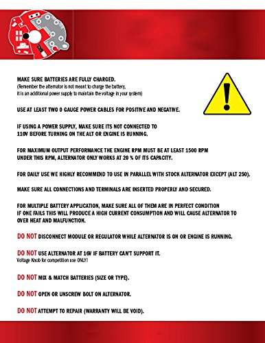 Not recommended for everyday use, this is a car audio add-on alternator that is used for SPL competition cars and audio applications. Limited LIFETIME Warranty for parts and repair