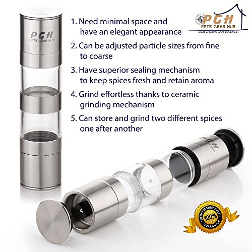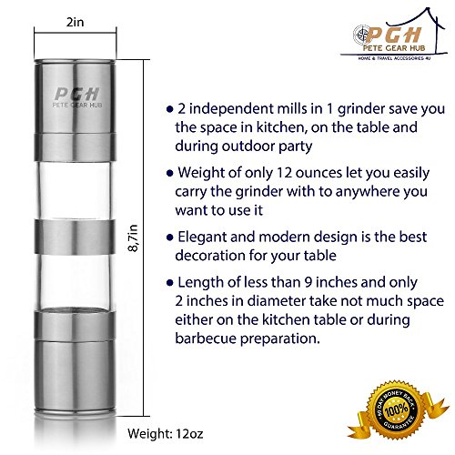SAVE KITCHEN SPACE. PGH salt and pepper grinder set is an excellent combo pepper mill accessory for your kitchen & dining area – the pepper grinder and salt shaker comes with two independent and adjustable grinders in a single unit and allows you to grind black pepper and salt efficiently & effortlessly