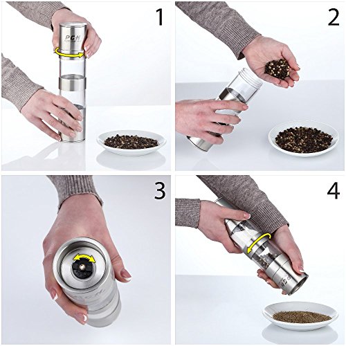 EASY TO USE. Our salt and pepper mills have two separate grinding mechanisms (salt & pepper) that can be operated independently. The pepper grinder with salt shaker is also very easy to clean to maintain high level of hygiene