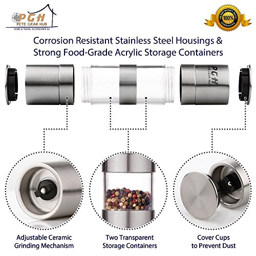HIGH QUALITY and DURABLE BUILD. The combo pepper mill salt shaker has 2 pepper mill and salt shaker and is made up of thick & strong food-grade acrylic. The ceramic grinding mechanisms of salt and pepper set built in the stainless steel housings