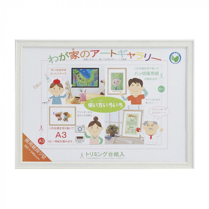 | 前面には環境にやさしく、軽くて丈夫なPETシートを使用。台紙にあるガイド線に沿って切り抜くとA3コピー用紙が飾れます。 |