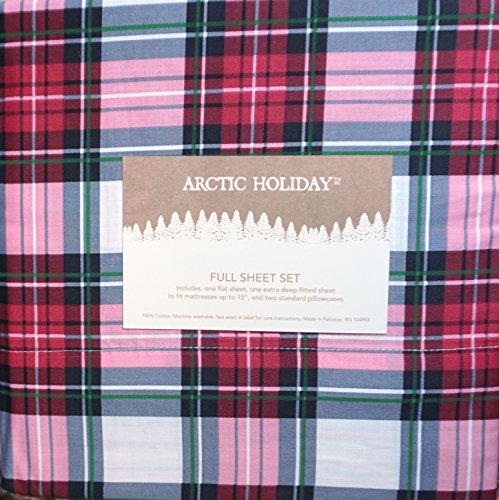 Arctic Holiday Bedding 4 Piece Cotton Full Size Double Bed Sheet Set Red Black Green Stripes Tartan Plaid Pattern on White