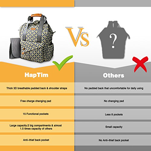 For The On-The-Go Parent (Or Sitter) Who Wants A Reliable Handsfree Functional Diaper Bag! For Who Consider These Features of Bag: Capacity -- Insulated Bottle Holder -- Padded Straps -- Stroller Straps -- Big Compartments -- Strong & DurableNow,Hap Tim come out this backpack diaper bag fully meet with market demand,It is not just a cute designer tote bag,but also a practical roomy stroller bag organizer !STYLISH! - The special shape design of front pockets cover is very cool,totally on-trend at the moment.