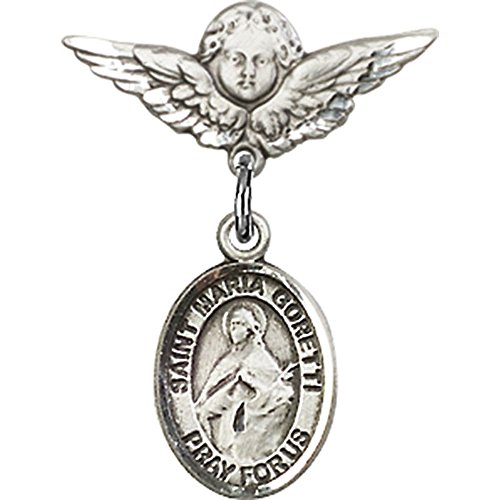-. Title : Sterling Silver Baby Badge with St. Maria Goretti Charm and Angel w/Wings Badge Pin 7/8 X 3/4 inches