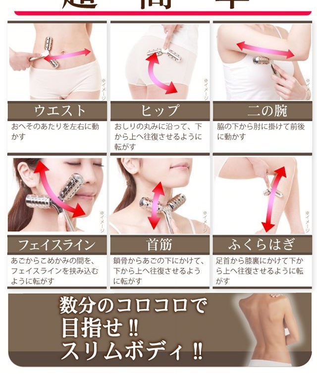 | ご使用方法 | 持ち手の一番厚みのある部分を中心に、しっかり握ってください。身体の丸みある部分に沿って、やさしく転がします。下から上へ往復させるように転がすのがポイントです。首筋、二の腕、肘、手の甲、ウエスト、ヒップ、太もも、膝裏、ふくらはぎなどにお使いいただけます。 |