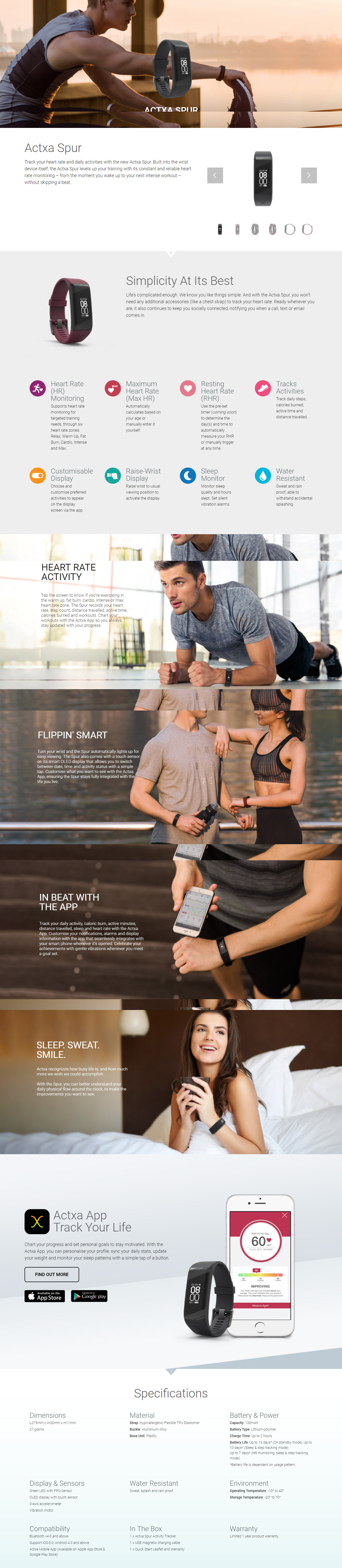 The Actxa Spur is an all-day activity tracker with continuous heart rate monitoring and heart rate zone indicators. Worn on the wrist instead of on the chest like the traditional chest strap, users may customise the list of desired key features to appear on their Actxa Spur daily, via the mobile app.