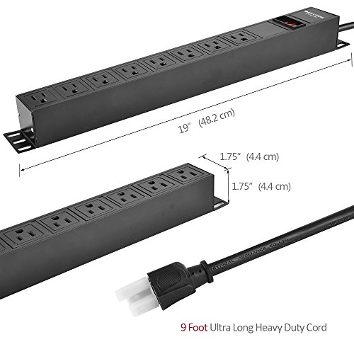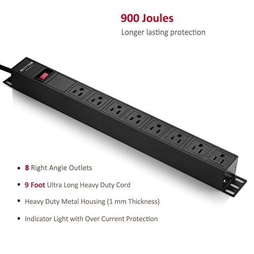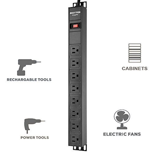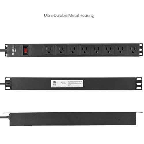 Bestten 8 Outlet Rack-Mount PDU, 1U/ 15A/125V, Aluminum Alloy Surge Protector Power Strip, 9 Feet Cord