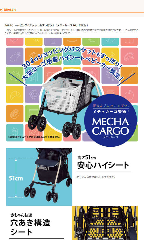 ●「ハンドルに荷物をかけたら倒れそうになってヒヤリ!」「買い物カゴを持ちながら押すのは大変!」そんなママのために、待望の大型カゴ搭載ハイシートベビーカー「メチャカーゴ IG」が誕生しました