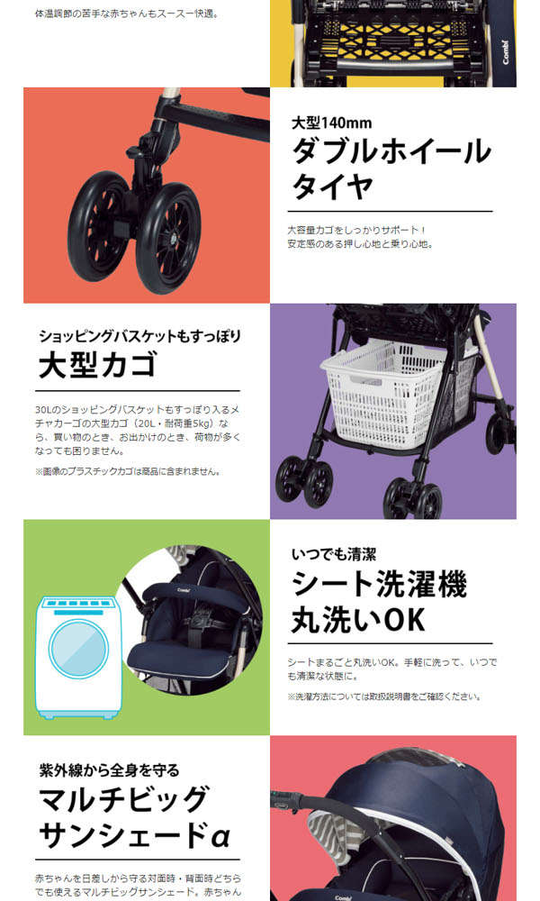 ●カゴ以外の標準機能も充実!乗せ降ろしのしやすい「安心ハイシート」や体温調節が苦手な赤ちゃんも快適な「穴あき構造シート」など、赤ちゃんもママも嬉しい機能もしっかり搭載しています