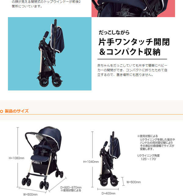 ●赤ちゃんをだっこしていても片手で簡単にベビーカーの開閉ができ、コンパクトに折りたためて自立するので、置き場所にも困りません