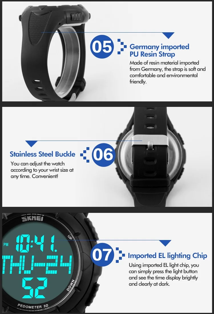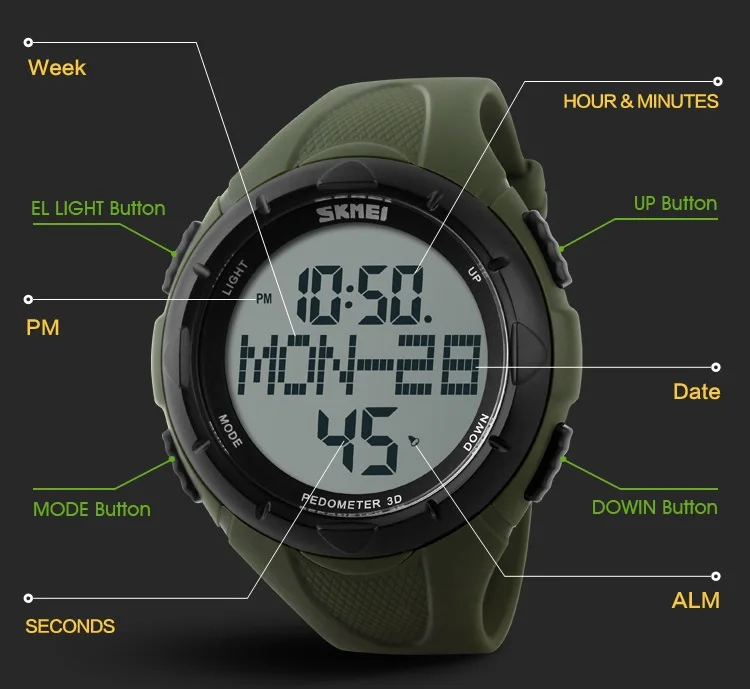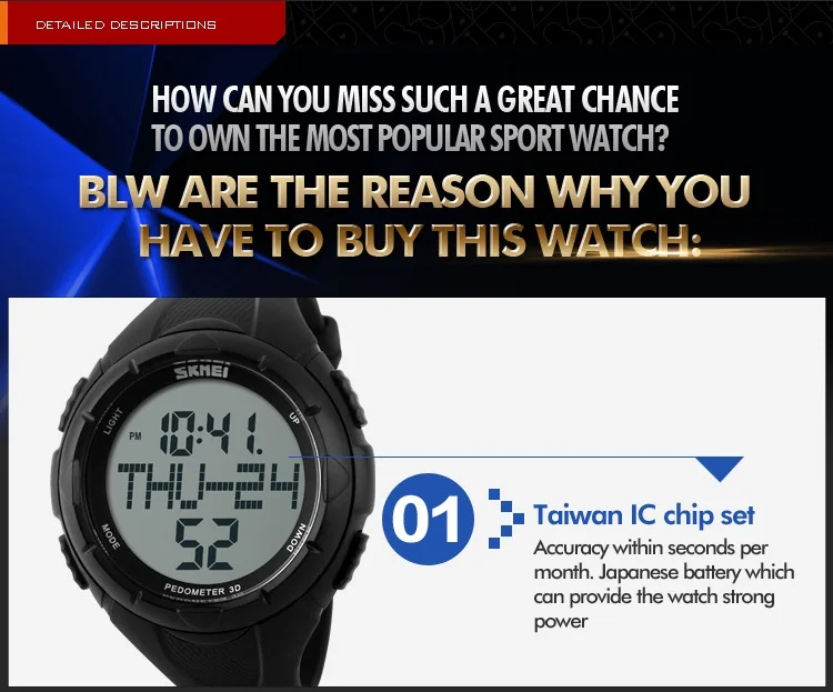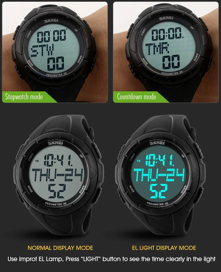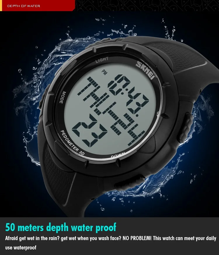Feature:Alarm,Back Light,Water Resistant,Shock Resistant,Stop Watch,Complete Calendar,Chronograph,Auto Date,LED display