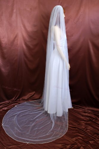 Studio : Velvet Bridal Publisher : Velvet Bridal Binding : Misc. Product Description Gorgeous brand new 1 Tier Cathedral Length veil with 72in width in fullness. The edge is beautifully finished with Rhinestone Edge. Standard cut design, the veil is cut in a soft rounded shape, the edging of the veil runs up the sides and is gathered into the comb. The material is soft and flowing, allowing the veil to drape perfectly.The veil has Silver wire comb attached - wire combs are more pliable and versatile, it can be contoured to your head shape and can be pinned if necessary (as opposed to plastic, which is thicker, inflexible and more cumbersome). Due to variations in computer screen settings, the color may appear differently than the actual color of the veil.Please order our color swatch so you can be confident that you are getting the veil color which matches your dress. 0