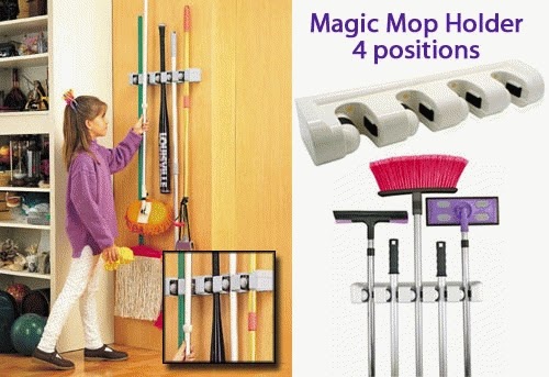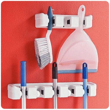 Magic Hanging Holder for storage systems for hygiene kits . Available with 4 types of slots . Save and hairdressing brooms , mops and other cleaning instruments in Magic Hanging Holder 4 Slots this . With this tool you're not so fast broom and mop so wide dry faster because it hung properly . Magic Holder designed with swivel ball holds various types of broomstick . Small or large not a problem . Plastic construction is lightweight but durable . This unique swivel ball holds tight fit with the thickness of a broomstick . Cushions made of anti-slip rubber so broomstick not shifted . The design with a solid to hang on the wall of the house . And couplers are available for easy installation and fast. Fitting for storage and arrangement of brooms , mops , and other cleaning tools . Fit to be a storage area in the kitchen, laundry , basement or garage .