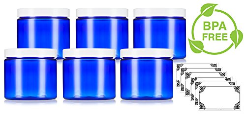 Cobalt Blue Large 16 oz PET Plastic (BPA Free) Refillable Jar with White Lids - (6 pack) + Labels