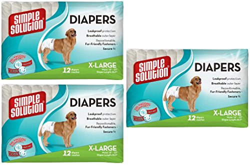 Studio : Simple Solution Publisher : Simple Solution Binding : Misc. Product Description (3 Pack) Simple Solution Disposable Dog Diapers, 12 Count each (36 Total) - Size X-Large. Simple Solution X-Large Disposable Diapers for dogs 50 lb - 90 lb and waist size 18in-23in provide leakproof protection and eliminate dog urine messes. Each diaper features a tail hole, repositionable fur-friendly fasteners and a comfort leg fit to give your dog a secure fit every time. Ideal for dogs with urinary incontinence, females in heat, and excitable urination. 0