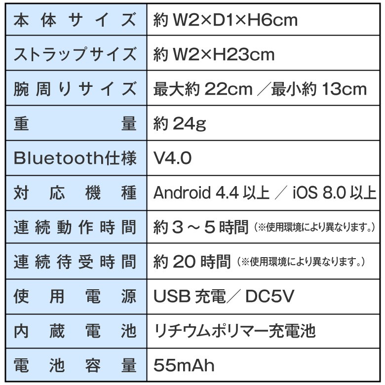 | サイズ | 本体サイズ:約W2×D1×H6cm ストラップサイズ:約W2×H23cm 腕周りサイズ:最大約22cm/最小約13cm |